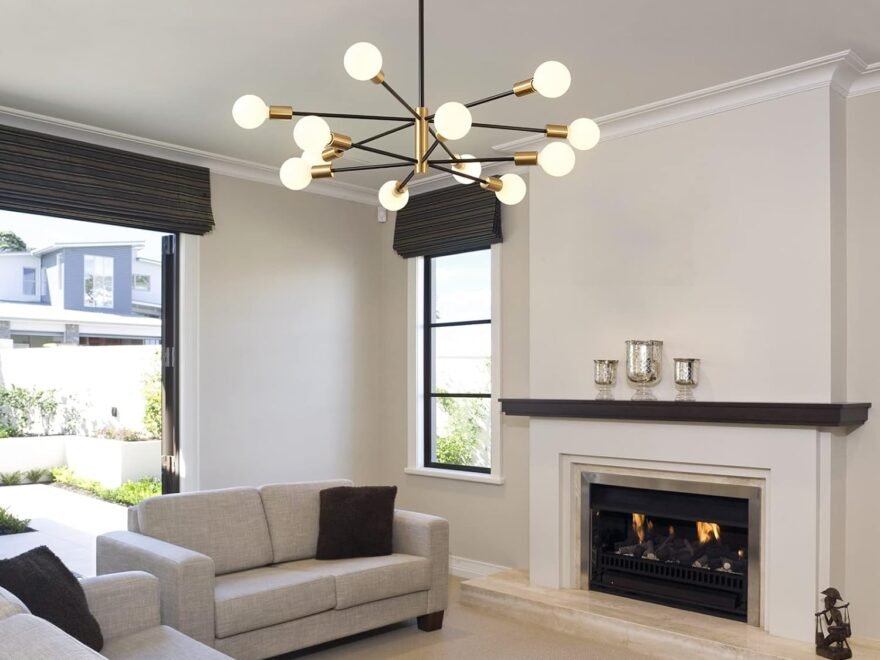 Descubra o Lustre Sputnik Moderno Preto e Dourado da KUCICO, design de meados do século, altura ajustável, fácil instalação e
