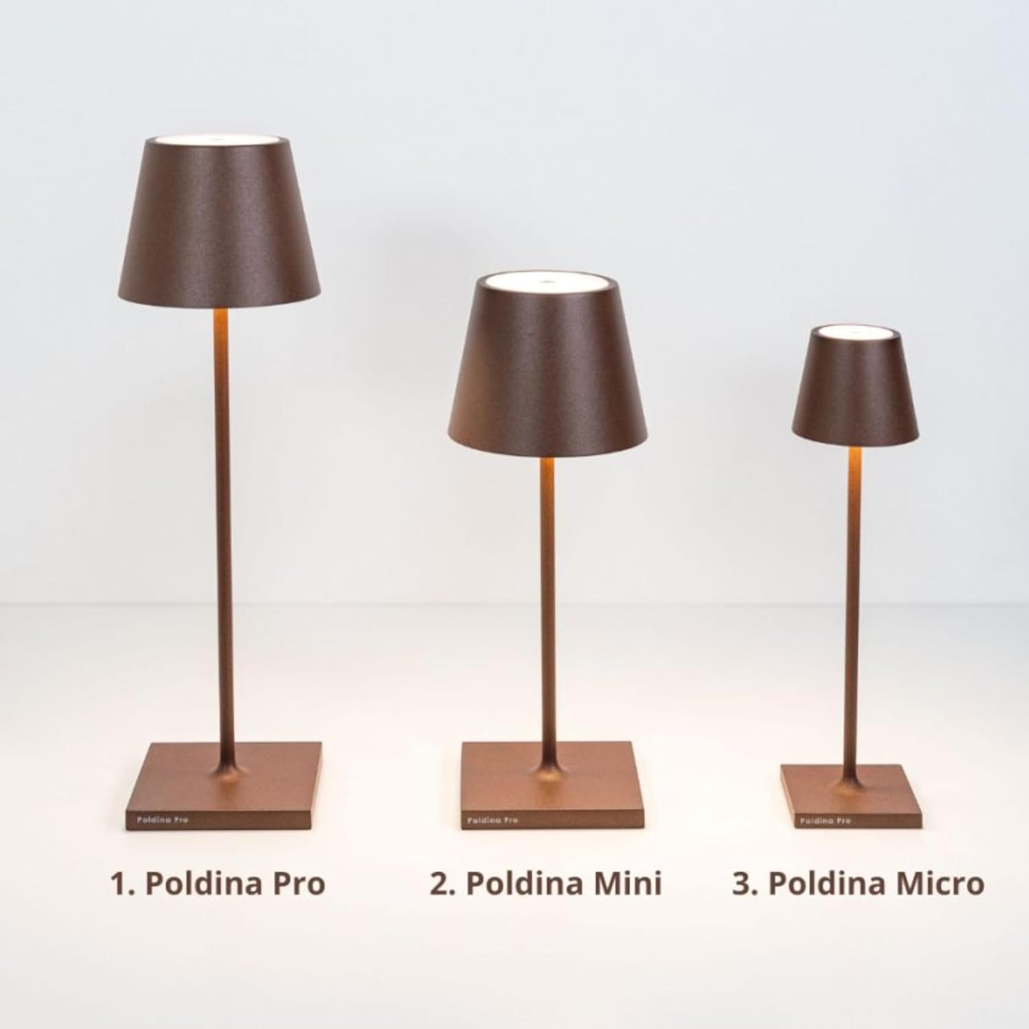Abajur de mesa LED Poldina Pro regulável em alumínio, proteção IP54, uso interno/externo, base de carregamento de contato