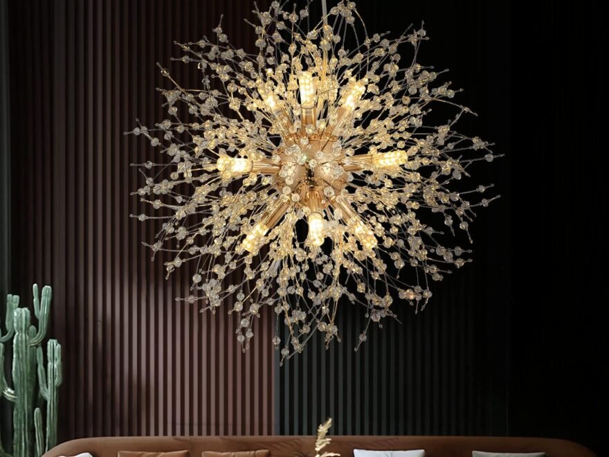 Leia MaisDescubra o Lustre de Cristal Moderno Dente-de-Leão com design Sputnik dourado e 9 luzes. Ideal para sala, quarto ou sala